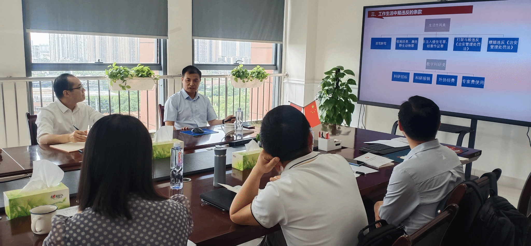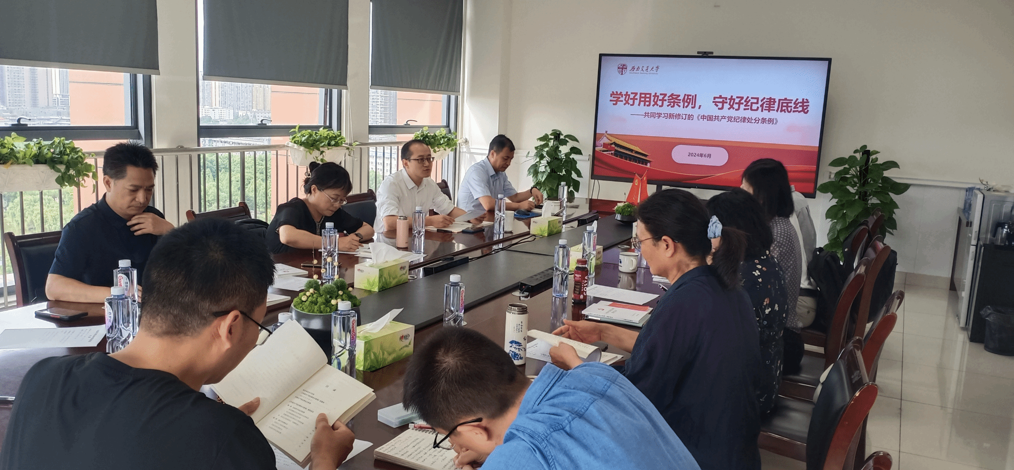张国正以“学好用好条例,守好纪律底线”为主题,围绕《条例》制定及修订情况、工作中易违反的条款两个重点方面,通过丰富的案例,以案说法、以案明纪,向参会人员讲授了一堂精彩的党纪学习教育专题党课。会议要求,学院党员干部要时刻保持清醒头脑,坚守廉洁底线,把遵规守纪刻印在心,内化为言行准则,进一步强化纪律意识,加强自我约束,增强政治定力、纪律定力、道德定力和抵腐定力,确保学院党委和师生支部政治过硬、确保党员干部和师生员工政治可靠、确保学院实现政治生态清明