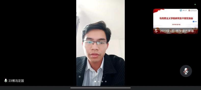 2023级博士班班长冯定国讲到,2023级博士班在这半年的学习和生活上,总体上达到了优良的效果,建议学院能够增加开设一些关于博士选题的系列讲座,帮助他们在选题上有清晰的目标。研究生会主席团成员章宇涵介绍了研究生会的基本情况以及对本学期研究生会所开展的工作进行汇报。