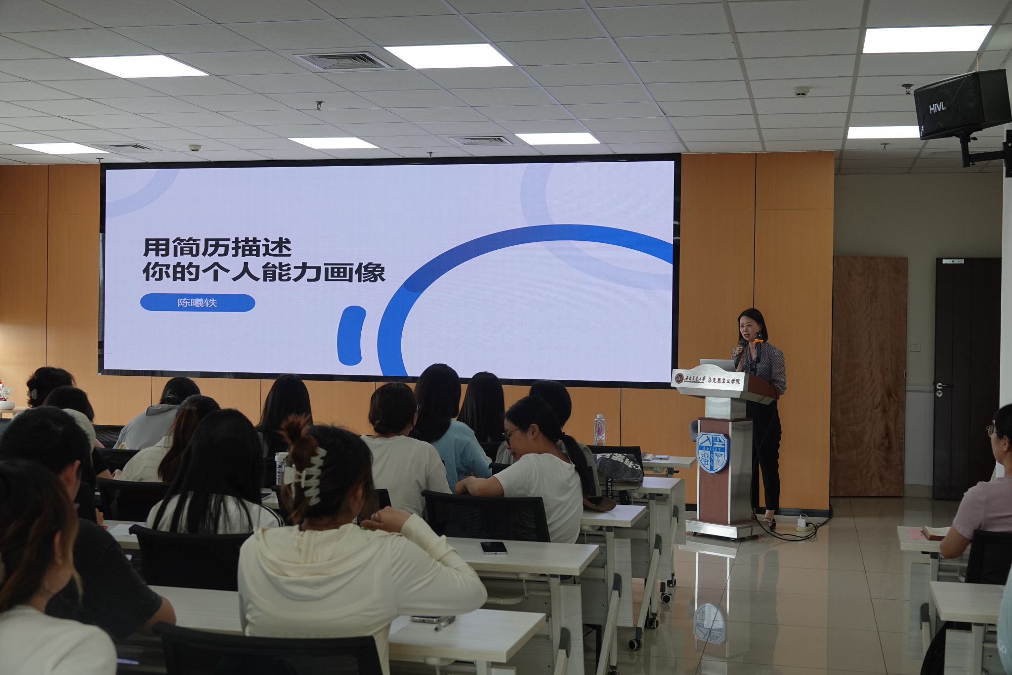 在谈到简历的结构和内容时,陈曦轶指出简历应语言简洁,结构清晰。她以广告为喻,指出简历的撰写应注重版面结构,突出重点信息,要用“动词”“数字”“关键词”彰显自身比较优势。她进一步强调,简历写的是“能力”而不是“经历”,同学们在撰写简历时要注重展示自己的能力和成就。
