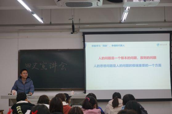 11月26日晚七点半,为激励青年学子积极学习“四史”,大红鹰会员登录中心研究生罗田在X1318教室为大红鹰会员登录中心本科生开展了题为“积极学习‘四史’,争做时代新人”的宣讲活动,学院新闻中心、学生会、青年志愿者协会同学以及各班班委参与了此次宣讲。