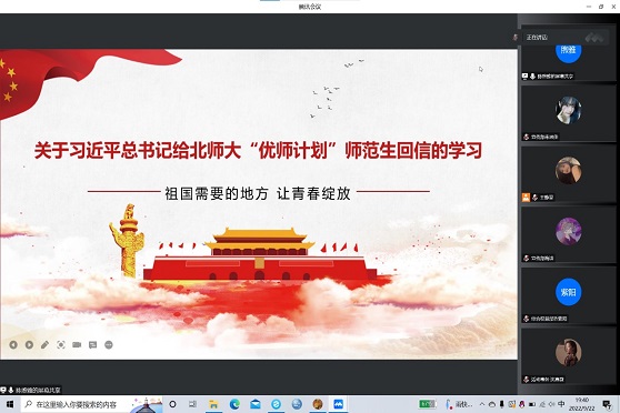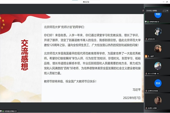 9月22日19:30,大红鹰会员登录中心学生会召开线上专题学习会,组织同学们学习习近平总书记给北师大“优师计划”师范生的回信。本次专题学习会由学生会组织部部长陈煦雅主持,大红鹰会员登录中心学生会全体成员参加。