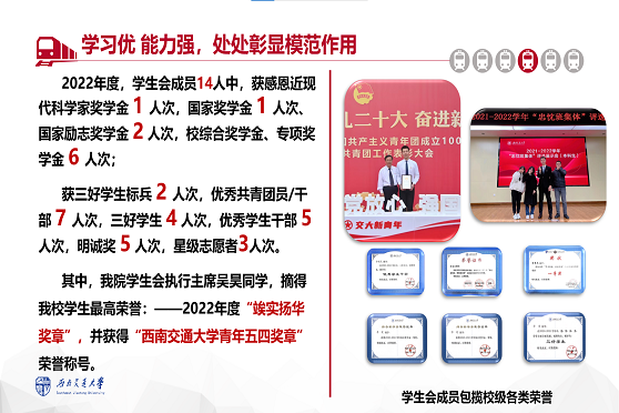 根据《西南交通大学2022年度学生会述职评议工作细则》,经过日常考核、材料综合评价、述职答辩,12月22日,经新青年素质网公示无异议,我院学生会成功评选为2022年度西南交通大学十佳学生会,综合排名第3名。
