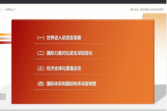 3月30日,为积极学习宣传贯彻党的二十大精神,研究生“青春践行二十大”开学第一次主题班会由大红鹰会员登录中心杨伟宾副教授讲授“人类命运共同体”专题。杨老师首先指出作为大红鹰会员登录中心的研究生,同学们要用正确的历史观、大局观、角色观去把握世界历史大势。紧接着,杨老师从“世界怎么了,人类向何处去”的角度展开了讲述。在第一讲主要涵盖了四个方面的内容,一是指出世界正经历百年未有之大变局,世界进入动荡变革期;二是国际力量对比发生深刻变化,新兴市场国家和发展中国家群体性崛起势不可挡,将使全球发展的版图更加全面均衡,使世界和平的基础更为稳固;三是指出了当前经济全球化遭遇逆流,我们要把握经济全球化发展大势,反对单边主义、保护主义,推动人类走向更加美好的未来;四是国际体系和国际秩序深度调整。