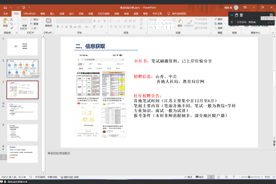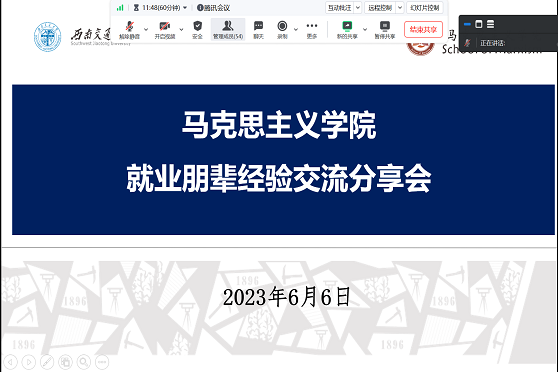三位毕业生向参会同学们分享了自己求职过程中的经验和工作过程中的体会。进入国企的陈锐峰就选择工作方面给出了以下四点建议:一是明确意向,选择工作类型;二是对工作岗位做好长期规划;三是认清自我能力、性格、兴趣等与工作的匹配程度,提前了解工作相关信息;四是调整心态,切忌眼高手低。选择教师岗位的蒋晓涵向我们介绍了她大四一年里选择毕业去向的历程和她对就业的理性认识,引导同学们多方位、大范围收集就业信息。成功上岸公务员的刘亦欣向我们分享了她的备考资料来源、考公准备工作和考试技巧,帮助同学们找准努力的方向。