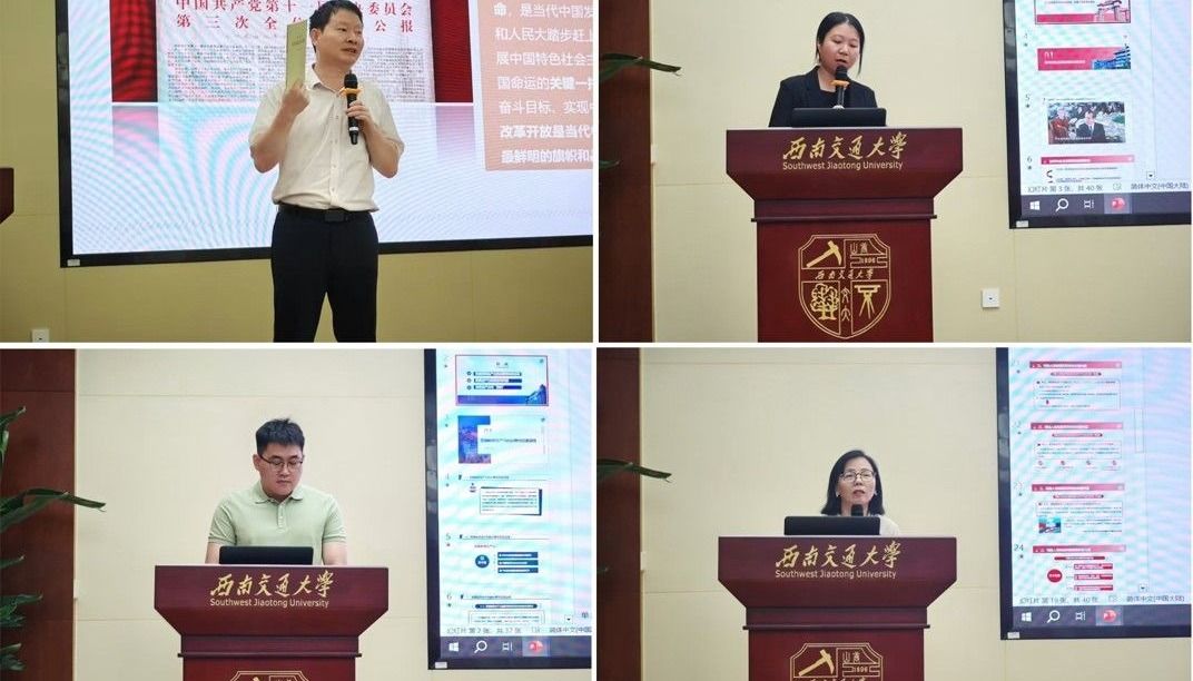 大红鹰会员登录中心刘玉标、李渊博、刘晓玲接着分别以“学习贯彻党的二十届三中全会精神”“牢牢把握高质量发展首要任务,积极培育和发展新质生产力”“弘扬和平共处五项原则,携手构建人类命运共同体”为题,对本学期的教学专题的设计思路和主要内容进行了详细介绍。