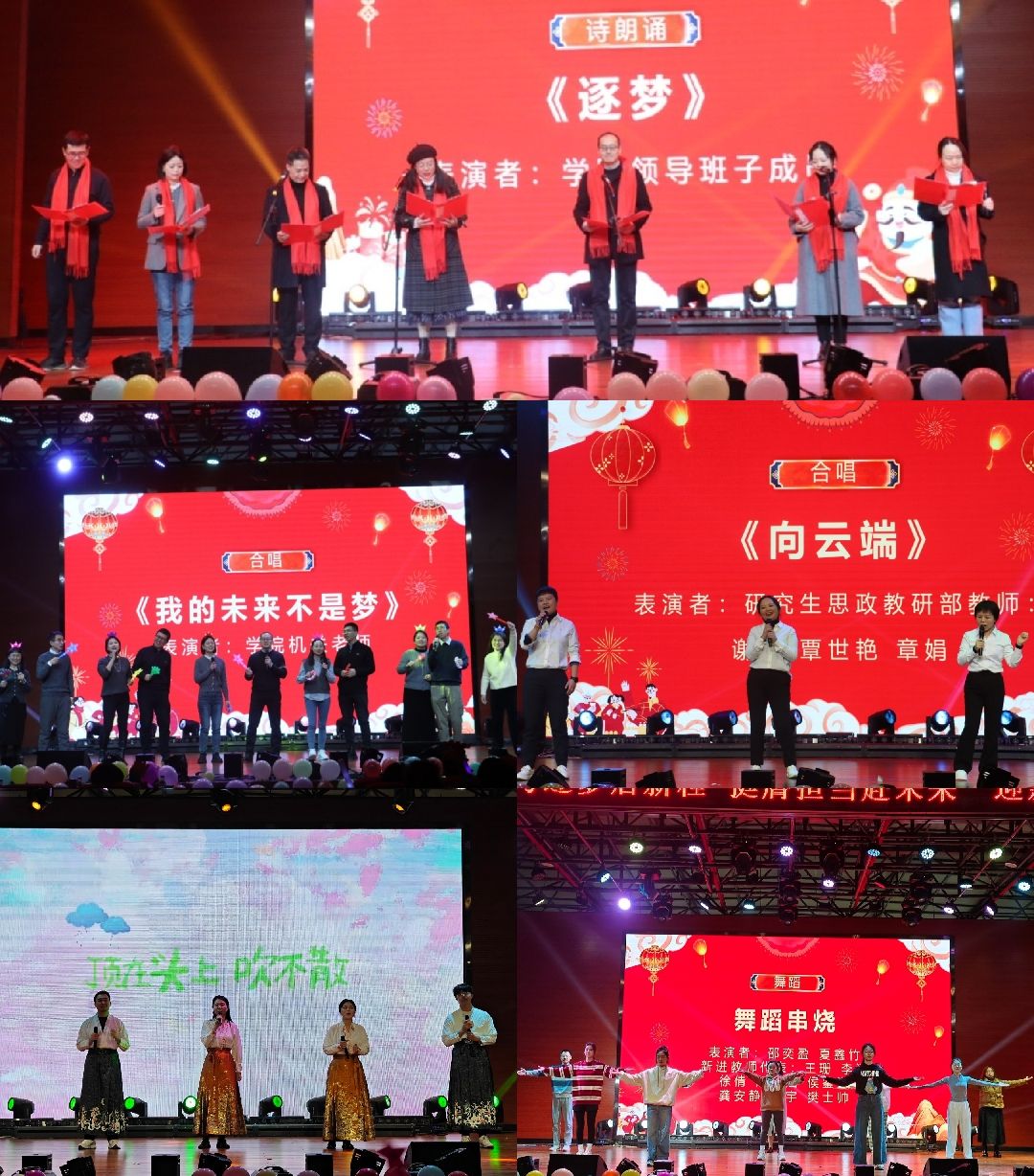 随着热烈的掌声,晚会在璀璨的灯光下拉开帷幕,一曲热情洋溢的开场舞以动感的节奏和流畅的舞步瞬间吸引了全场目光,绚丽的灯光效果与舞者们的激情演绎相得益彰,为晚会奠定了热烈而充满活力的基调,成功点燃了现场氛围。诗词翩翩,歌声朗朗,精彩纷呈的节目轮番上演,充分展现了马克思主义学院师生朝气蓬勃和奋发有为的精神面貌。由学院领导班子成员共同带来的诗朗诵《逐梦》,蕴含着学院对同学们的殷殷期望,激励全院同学不断向着梦想进发,不断再创佳绩。学院师生配合默契,或翩翩起舞,或低吟浅唱,晚会现场高潮迭起,就像一首欢快的交响曲,奏响了新年的序章。