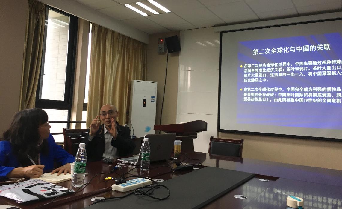 仲教授从19世纪中英茶叶与鸦片贸易的视角来解读经济全球化的发展,及其对中英两国发展的影响。仲教授指出经济全球化一开始就与成瘾性商品相关,茶叶和鸦片作为成瘾性商品,其贸易看似是简单的商品贸易,实则背后有强大资本力量的推动。仲教授引经据典,他指出工业革命初期,英国人喝茶已经成为了一种普遍现象,茶叶的输入带动了消费,促进了经济的发展。而由于中国近代国情限制,中国并没有成为英国的工业品市场,并形成了鸦片与中国的苦难相始终的现象。在最后,仲教授结合清华大学学报的论文选稿要求为学院师生在论文写作上提出了宝贵的意见和建议。